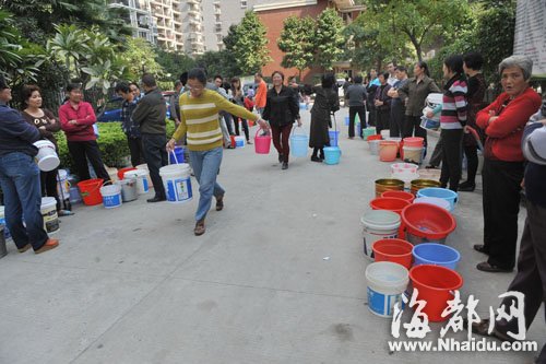 秋月苑小区内业主拿着五颜六色的装水工具在等待第二辆水车来救援 东南网11月23日讯(海峡都市报 记者汤先增 毛朝青 文/图) 20日,福州福湾路盘屿路口,因地基塌陷,一根直径300毫米的水管被压裂,导致周边上千户居民已断水三日。 昨日上午,记者在秋月苑小区大门口看到,一辆洒水车停在附近,许多居民提着大大小小的水桶,拥挤在洒水车旁边接水。其间,一名依姆和一名依伯因抢水管接水,两人发生口角,后被大家劝开。 正在接水的居民告诉记者,停水已三天了,停水后,小区居民只好四处借水,有的干脆暂时搬家,有的只好购买矿泉水使用。居民说,还好这两天来,有一名好心市民运送了两大车自来水到小区来,给居民们使用。 居民陈先生告诉记者,由于大部分都是老人居住在小区里,昨日上午10时许,一位依姆因提水过度,当场晕倒在地,被送到医院治疗。 随后,记者在附近找到了这位好心市民,他说,自己就居住在附近,前天听说秋月苑停水多天,就趁着下班时间,运送12吨自来水给居民使用。这位市民并不愿透露自己姓名,只表示这是小事不值一提。 秋月苑小区物业人员告诉记者,小区共有40栋楼,3000多户居民,停水主要原因是福湾路附近一根水管破裂造成的。 记者在福湾路盘屿路口看到,福州自来水公司人员正在抢修破裂水管。 现场一位负责人告诉记者,地下淤泥影响到地基不均匀塌陷,一根直径300毫米的自来水管被压裂,造成台屿村和秋月苑小区停水。该负责人表示,因为地下地形比较复杂,还无法得知何时能修复。 |