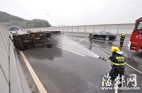 货车“裸运”盐酸 福州三环路上侧翻