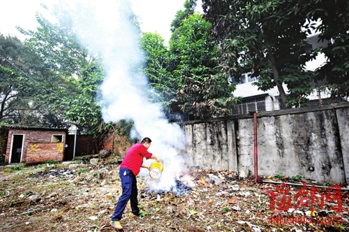 华鸿路边有人烧垃圾,记者提醒后,工人才提水把火浇灭 东南网12月9日讯(海峡都市报记者 吴臻 汤先增 关铭荣 文/图)为了躲雾霾,福州的林女士窝在家里,可却被家边上烧垃圾的浓烟,熏得直咳嗽。林女士家住鼓楼华鸿路边的益力小区,而烧垃圾的福州协惠汽车服务有限公司,就在她的小区隔壁。 “雾霾都来了,福州的空气都出现中度污染了,竟然还有人烧垃圾?”昨日下午3时许,在家休息的林女士被一阵浓烟熏醒。林女士说,她就怕雾霾天气对身体不好,才取消了所有的出行计划。“为了防止雾霾飘进屋内,我特地将窗户留了一条细缝来通风。”林女士说,当时她恰好躺在床上睡觉,突然觉得喉咙特别难受,一阵猛咳之后,人就醒了。醒来后发现卧室内弥漫着一股烧焦的气味。转了一圈,发现这股浓烟是从窗外来的。打开窗户一看,小区隔壁的一块空地上,有人在烧垃圾。 |