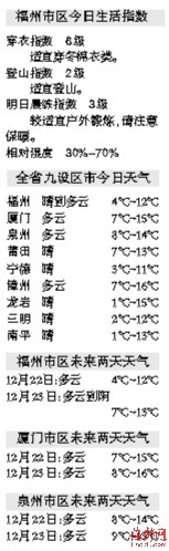 - [ 12-20]太阳露脸福州20日起3天都是好天气 最低温将降至4℃