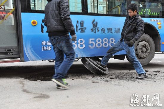 福州台江路铺沥青撬起窨井盖 无警示卡住公交