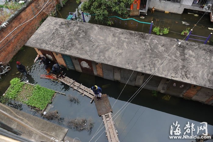 整个小区都泡在水中,居民在小区里搭“桥”