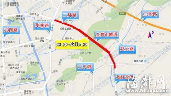 金鸡山隧道交通管制(黑粗线示意) 东南网4月2日讯(海峡都市报记者 陈恭璋 通讯员榕警)昨日,记者从福州市交巡警支队获悉,今日开始,每日23时30分至次日5时30分,金鸡山隧道(北起北环中路华林路口,南至连江北路鹤林高架桥起桥处)实行临时交通管制,禁止机动车通行,该次管制时长预计15天。 警方介绍,因二环路金鸡山隧道拓宽改造项目施工需要,施工方需对已封闭施工的南洞进行爆破施工,并对现有通行的北洞薄弱位置进行加固。为减少市民出行影响,警方决定将交通管制时间选在车流量少的深夜。 警方提醒,管制时段内,请车主提前安排好路线,可由周边的三环路、登云路、三八路、六一路和塔头路等道路绕行。 |