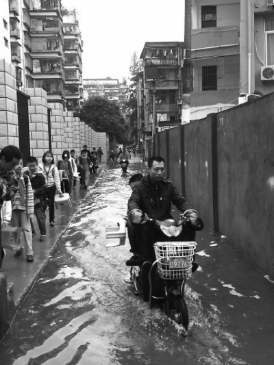 硫酸厂宿舍的居民们扶着鼓山镇领导上了一辆三轮板车,周围居民拍手叫好 □本报记者陈雪芳刘朔文/图 一夜暴雨,福州福马路硫酸厂宿舍楼区内低洼处,积水高度从鞋尖一寸一寸上涨,没过门槛,涨进屋内,直到高度超过178cm身高男子的膝盖,将一楼住户的家具浸泡一遍。昨日一早,这里200多户居民打开房门,看着眼前汪洋般的小区空地,束手无策。 然后他们聚集在了附近一段三环路上,等着来人解决同时,也堵住了路面。直到鼓山镇相关领导走进硫酸厂的宿舍,用脚踏三轮车趟过齐膝般的积水,人群中响起热烈掌声。三环来往车辆终于得以疏通。 一夜醒来,锅都顺水漂流了 前夜九时许,不停歇的阴雨阵势突然加大。郑青从宿舍入口回到家门,被打湿一片。意识到这雨一来,宿舍内必然又要被淹了,住在一楼的他找来早前准备的沙袋,挨个堵在门前。 但昨日一早六点多,积水还是漫过门前沙袋,穿过堂屋,流进了卧室,儿子房间内的电脑主机,也作废了,打开厨房的门,原本放在地面上的锅漂至门前。 与此同时,住在二楼的庄永宁打开房门,轻车熟路,他挽起裤脚,踩着拖鞋出了门,沿着三环路走到附近“远东物流”门前,发现和宿舍区内排水系统紧紧相连的“河道”上果然堆满了东西。他打电话叫来一辆吊车,想着将河道里堆填的东西拾掇出来,宿舍区里的积水也就能慢慢退了。 这些年来,逢雨硫酸厂宿舍必淹已不是新闻。作为宿舍区内物业管委会主任,每次出状况庄永宁都会先到“河道”瞅上一眼。尽管,那早已不能被称之为“河道”了,因为周围工地的渣土,已经将河道填满,只有底下铺设了一根管网。