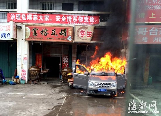 福州一餐馆门前面包车靠煤炉太近 瞬间成“火车”