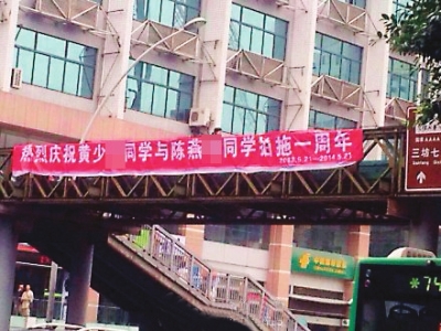 福州东街口天桥现庆祝拍拖横幅 挂出没多久即被撤收