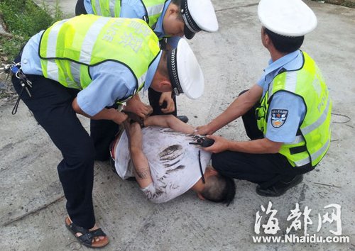肇事男狂奔逃逸,民警双向包抄 民警寻找肇事男,可是他却不见了。目击者告诉民警,事故发生后,肇事男从车里爬出,然后穿越中间护栏,进入B道,往福州方向逃跑了。民警赶紧弃车,也翻越护栏,进入B道,沿着男子逃跑方向展开追击。同时,另外一组民警驱车从A道(福州往泉州方向)赶来堵截。两组人马双向包抄逃逸男子。 紧张的追捕过程中,附近的村民也提供了线索,说有一名穿白衣的男子就是肇事者,在高速上狂奔,两组民警加快了追捕速度,最终在2117公里的一个涵洞附近发现了逃逸男子。 发现B道后方追来的民警,嫌疑男子企图跨过中间护栏,跑到对向的A道上。可当男子发现A道上另外一组民警也赶到现场进行堵截后,就放弃了跨越,在B道上到处乱窜。眼看被前后夹击,无路可逃,男子慌乱中从4米多高的涵洞顶上滚下,逃出高速路,到下方村道上。最终,两组民警前后包抄,成功将他制服。