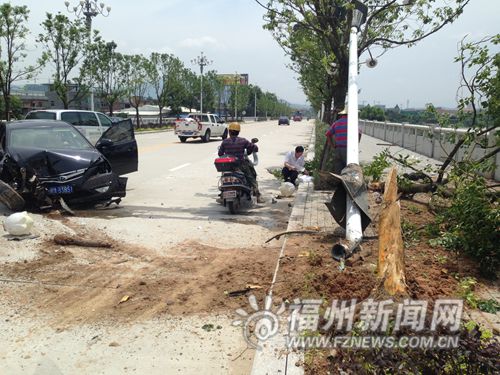 小车失控冲上江滨人行道 撞倒行道树驾驶员受伤