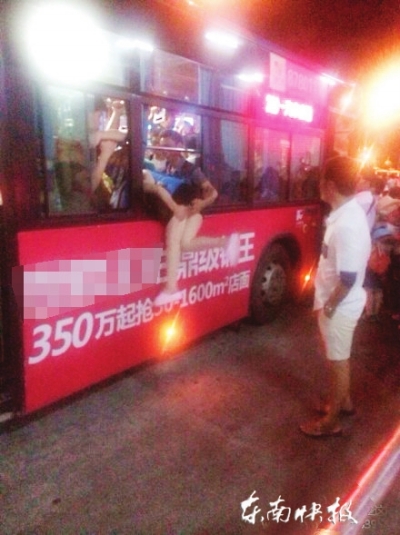 福州火车南站客流量大 “女汉子”爬窗上公交车