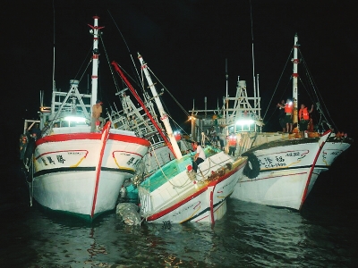 遇险台轮(中间船) 东快讯(记者陈钦祥通讯员陈选斌文/图)前日中午12时许,在平潭与福清交界海域,一艘台轮在驶回台湾途中,不慎与一艘浙江万吨商船相撞。台轮的机舱被撞毁进水,随时会有沉船的危险。事发后,福清南青屿边防所紧急出动,经过8个多小时的救助,遇险台轮和4名台湾渔民终于安全靠岸。不过,因受机油污染影响,台轮上的10吨鱼货全部暴毙,目前已紧急进行了处理。 记者了解到,对于事故具体原因,目前平潭海事局已介入调查。 遇险 两艘船海上发生相撞 台轮机舱进水随时沉船 前日中午11时许,一艘满载10吨鱼货的“金鼎丰”号台轮,从福清南青屿码头出发,缓缓地驶回台湾新竹渔港。约一个小时后,当台轮行驶到平潭海域(与福清交界)时,来自台湾的船长伍生兴突然发现迎面驶来一艘“巨无霸”商船,两船的距离非常接近,并眼看就要撞上了。 “不好了!要迅速调转方向!”伍生兴立即叫来船上另外3名台湾渔民,合力紧急翻转船舵。可谁料,此时船舵却出现了故障,任他们4人怎么转动也都无动于衷,最后只能眼睁睁地看着台轮撞上“巨无霸”。 这艘“巨无霸”是来自浙江宁波的万吨商船,属过往船只。“它为何会出现在我们相向的航线上?”台轮上的4名渔民感觉很纳闷。 “突然发生这样的险情,我们都吓傻了,也不知如何是好。”渔民说,发生相撞后,台轮甲板上全部都进了水,船体也多处出现严重破损,特别是机舱被撞毁后,船内顿时涌入大量的海水,船体开始出现倾斜,并随时有沉船的危险。 随后,4名台湾渔民在关闭船舱后,就立刻向福清南青屿边防派出所求助。 |