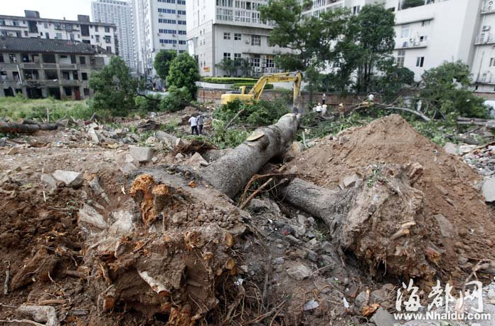 一些被推倒的大树遭截根截枝 东南网9月14日讯(海峡都市报记者 周锡银 包华 文/图) 关注理由福州黄金大酒店后门停车场对面的空地上,十多棵老树竟被连根拔起,还遭截根截枝。接市民举报,记者赶到现场,看到十多棵茂盛的大树被挖掘机推倒,切成一段段,原本树荫成片的地块,只剩残根败枝。 对此,福州市园林局执法支队相关负责人表示,他们也有接到群众反映,经调查,该地块确有经审批,但不是砍树,而是将该地块的30棵树移植。 为何移植会变成野蛮砍树?该负责人表示,关于如何移植的标准,并没有清晰界定,只要一年后移植的树木能存活即可,如果一年后这些树不能存活,他们将追究相关单位的责任,并实施处罚。