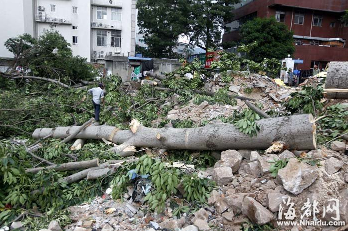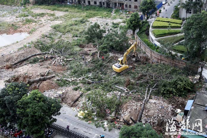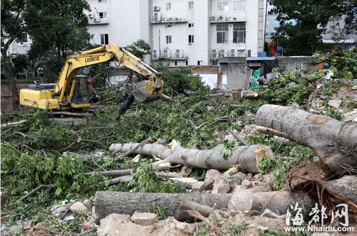 施工现场,十多棵大树被推倒,现场一片狼藉 现场:大树被拔,部分树根被锯断 “心里很难过,这些树就这么被砍掉了。”家住福州火车站附近小区的杨先生致电本报热线968111称,昨日上午,他路过黄金大酒店后门停车场对面的拆迁工地时,看到一棵棵茂盛的老树被连根拔起,倒在路边,觉得很可惜。“太可惜了,这么大的树。”记者赶到现场时,很多居民围在现场,对老树被砍议论纷纷。 记者来到现场时,被眼前的情形震住了:被连根拔起的大树,有的高达十几米,有的枝干粗壮到需两个人才能环抱,一些大的树根已被锯断。在工地中央,大量枝干和绿叶倒在了一起,一些大树的长躯干也被切成一段一段的,随意摆在小土堆上,树干以外的枝叶全都被剔除一空。 昨日下午4点多,工地上的挖掘机还在不断作业。“人挪活,树挪死。”在现场围观的一位依伯说,这些树连根被砍成一段一段的,大树要大根,但这些树的根只剩下残根了,要想生长回原貌,恐怕很难。