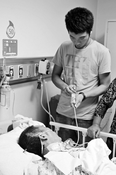 丁一正在给昏迷的父亲通过胃管喂食 新闻回顾: “我借不到钱了,昨天我老婆做腰椎穿刺,我在她的医疗卡里面充了5000块钱,那是我身上最后一笔“大钱”。我爸跟我老婆的药已经停2天了。”一个月前,那场噩梦一般的车祸,导致河南来榕打工小伙子丁一的幸福生活被击碎。丁一的新婚妻子至今仍在ICU,而父亲在抢救室,俩人都还昏迷着。昨天,丁一给东南快报记者打来电话,他说,事故的责任认定书已经下来了,双方是五五分责,他还没有签字。 电话里,丁一的声音几度哽咽,目前最大的问题是,他已经没有地方借钱了。而根据法定程序,福州市琅岐交通运输有限公司只有在丁泽潮(丁一父亲)、时雪凡(丁一妻子)治疗终结或者定残后,才会支付其相关费用。 丁一的父亲恢复良好手脚会动 医生称若现在放弃治疗太可惜 在福建省立医院16楼21区的抢救室,记者再次见到了丁一。丁一坐在床边,胡子拉碴。他的父亲丁泽潮侧躺在病床上,原先堆满药物的床头柜空了,病房也是空荡荡的。“都撤了,药物、仪器都撤了,只剩下氧气还留着,我老婆在ICU里的药物也都撤了”,丁一眼圈红了。 “你也看到了,我爸的情况很好。他今天早上还半睁过眼睛,手脚都会动了,医生说他醒来的可能性很大。”丁一说,医生曾经告诉他,他父亲丁泽潮颅内已经没什么问题了,而之前的并发症如肺部感染、胃出血等也已经痊愈,现在是一个很稳定积极的状况,只需要药物维持加上复健治疗就可以了。丁一记得,医生曾经再三提醒他,如果现在给他父亲停药太可惜。 “我已经跟亲戚朋友借了快30万了,连没说过几句话的小学同学,我都厚着脸皮开口去借钱了。”丁一告诉东南快报记者,车祸至今已经一个多月,他妻子花费了约27万,而父亲花了约17万,医疗费花了40多万元。但是从9月11日起,丁一就再也没能借到钱,“我一个星期前就拜托医生帮我们把不必要的药都省了,因为我们实在是没钱了。”9月14日,他还是只能看着父亲和妻子被停药。 |