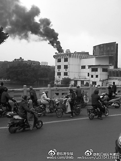 事发时浓烟笼罩(图片来源于微博) 东快讯(记者陈雪芳)“整个福新路居然被熏黑了!”“还有人在上面!”昨日上午,几名网友几乎同时发布信息称,福州福新路一楼房起火,情况危急。东南快报记者随后核实到,其实是工人掉落的烟头闹了乌龙。 昨日上午,不时有网友发布信息,称福新路福州市园林局附近一处楼房着火。记者注意到,网友发布的图片中浓烟滚滚,有明火冒出。 不过,东南快报记者赶到福州市园林局附近时,却始终找不到被火烧过的痕迹,也没有消防车停留在附近。记者几经询问后了解到,着火的是福州市晋安河公园管理处。管理处相关人员介绍,昨日上午10时许,几名工人在顶楼拆卸时不慎掉落了烟头,引燃地面上的塑料泡沫,从而燃起明火。 “因为是塑料,所以起了很大的烟,我们用灭火器很快就扑灭了,消防车也没来。”工作人员说。 |