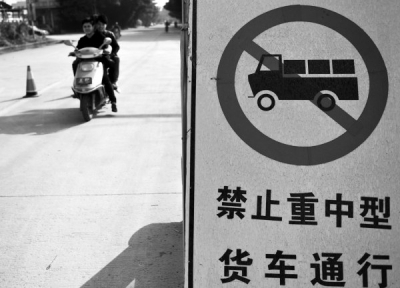南方钢材市场附近的道路入口,已摆放禁止重中型货车通行的牌子