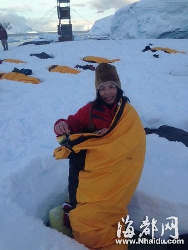在南极露营,需要睡在坑内,避免被风吹走,是一项抗寒挑战 露营登山游泳 不留任何垃圾 12日至15日,团员们在库佛维岛、纽马水道、洛克罗伊港、古迪尔岛、威姆米娜湾、欺骗岛、月亮岛等处游玩参观。纽马水道波平如镜,大大小小的浮冰洒在水面上,雄伟的灰白色山脉一半在水面上,一半在水面下,景色奇特。 欺骗岛是一处活火山岛,上次爆发是1969年,现在正处活跃期,随时都可能喷发,受到地热影响,一些地方露出黑色的岩石。登山时,山脚下白雪松软,一步下去能踩出一个大坑,越接近山顶,地面越坚硬光滑,行走艰难。地面上开裂的缝隙显示出当年火山爆发的威力,山势陡峭,直面悬崖和大洋。江依姐走得胆战心惊,不少人下山时连滚带爬。 团员们必须回到船上用餐和如厕,不准在南极留下任何垃圾。13日晚,探险队邀请团友在一处孤岛露营,8位中国人响应,江依姐也报了名。他们要先根据防潮垫的大小挖坑,晚上穿上三层厚的睡袋睡在坑内,次日再将坑填平。营地附近的山坡上埋了个带盖子的桶,作为厕所,边上还用防水袋装了手纸。在“厕所”前方不远处放着两把铲子,交叉放置表示“厕所”正在使用中,平行放置则表示无人使用。露营结束,工作人员会专门进行处理。面对这个圣洁的冰雪世界,江依姐觉得,留下任何一点垃圾,都是人类的耻辱。 15日,手机因为寒冷而死机,江依姐仍换上泳装,和几位勇士一块下水体验真正的“冰泳”。这趟南极之旅,中国团内仅有三个人收集全“登上南极大陆”、“南极露营”、“南极游泳”三份证书,江依姐是唯一的女性。