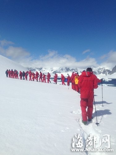 部分团员冲向冰洋,挑战自我 长城站里遇老乡 听企鹅动人故事 在风浪平静的时候,团员们喜欢来到甲板上。巨大的冰山漂浮在洋面上,雪白中泛着蓝光,时见鲸鱼出没,飞鸟成群,美景让江依姐非常震撼。 11日,抵达乔治王岛,众人要穿上标配的衣物,带着背包和物品先经过登陆舱“消毒”,避免带入垃圾或者植物种子,再乘坐专门的橡皮艇上岸。乔治王岛是南极地区科考站分布最密集的区域,有九个国家的科考站,其中包括中国的长城站。团员们被允许进入长城站的一座楼参观,内有餐厅,江依姐还遇到两位在站里负责机械工作的福建老乡。长城站门前立着一根柱子,每个来到长城站的人,可将家乡地名写在牌子上,将牌子挂在柱子上;工作人员告诉江依姐,柱子上有“福州”的牌子,但这回被积雪埋了。 12日,团友们登上天堂湾,真正意义上的南极大陆。进入大陆后,每个人靠衣服颜色区分身份,红色的是游客,橙色的是岛上负责安全的探险队员,黄色是鸟类专家。岸上的企鹅并不怕人,它们在岩石上筑窝孵蛋,在冰雪上有固定的行走路线,被戏称为“企鹅高速公路”。只有鸟类专家才被允许接近企鹅,游客们被告诫,不准靠近、惊扰、伤害企鹅,也不能在“企鹅高速公路”上停留,避免企鹅绕路打滑。 江依姐发现,一群黑白企鹅中混着一只头上有着黄色羽毛的企鹅,显得有些孤单。领队介绍说,黑白企鹅是帽带企鹅,黄毛企鹅是麦克罗尼企鹅,后者是一种非常坚贞的企鹅,有着固定伴侣;这只麦克罗尼企鹅是走失到此处的,4年多来孤单生活,不再重新恋爱,多位领队和探险队员都知道这只特别的企鹅,期待它能早日回到族群。