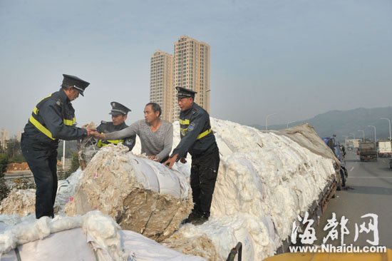 八名热心保安义务帮忙装车 东南网3月15日讯(海峡都市报记者 毛朝青 文/图)昨日凌晨5时许,一辆车牌号为苏CY0939的大货车,途经福州三环路园中大桥附近时,因绳索断裂,导致车上的棉絮散落一地,幸好在附近值勤的8名保安伸出援手,义务装车数小时,才将散落的货物全部装上车。 据货车司机介绍,因为该路段有上下坡加上拐弯,车上的货物在摇晃的过程中绷断了捆绑的绳索,导致货物散落路面。就在他一筹莫展时,在附近值勤的8名保安伸出了援手。 其中一位保安告诉记者,他们是晋安区公安分局的保安,负责该三环路段的路况,为了保障道路顺畅通行,他们八人第一时间赶到现场帮忙装车。 |