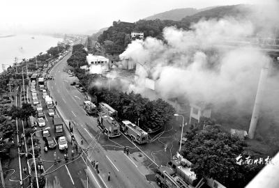 不少市民将车停在魁浦大桥上,并且翻越护栏 □东快记者王一刘兴文/图通讯员黄绿荣刘万林 熊熊烈火烘烤着冷冻仓库里30瓶氧气瓶和4个液化气瓶,气瓶发出慎人的“嗞嗞”泄露声,爆炸一触即发。消防战士几次试图闯入火场转移气罐,却一次次被滚滚浓烟逼出…… 昨日中午11时许,福州市马尾区江滨东大道,魁岐魁浦车站附近的一间冷冻仓库发生大火。截至下午3时许,险情才被控制,其间消防官兵冒险抢救出未爆燃的“定时炸弹”。 据了解,大火疑因工人在拆除冷冻仓库时,不慎引燃仓库内保温材料所致,事故未造成人员伤亡。 仓库着火影响交通路面排起车龙 据与起火冷冻仓库仅一墙之隔的居民林先生回忆,昨日中午11时许,他和家人正在吃饭,忽然闻到刺鼻烟味,又听到窗外传来“起火了”的呼救声,他丢下饭碗出门查看。 这一看,让他大吃一惊。“黑色的浓烟,从仓库每一个可以透气的地方‘挤’出来,蓝天变成黑色,闻一会烟,头就会疼。”陈先生说,他急忙抱起不到1岁的孙子,飞也似的远远跑开。 东南快报记者在距离火场还有两公里处,便闻到刺鼻的焦煳味,并看到直冲而上的滚滚黑烟。 据了解,起火的是福建省水产供销公司的冷库,属于单层钢筋混凝土结构建筑,过火面积约300平方米。 起火后,11辆消防车和50名消防战士赶赴现场救援,战士们分批把守住仓库各个角落,用高压水枪向内喷射,以求尽快控制火势。 江滨东大道也因为紧急救援,双向车道临时封闭。民警则在数十米开外,设立起警戒线。江滨东大道上一时间排起一眼望不到头的车龙。 因为这场大火,冷冻仓库一侧魁浦大桥上也弥漫着浓烟,导致桥上车辆减速。但东南快报记者发现,有些同司机为看热闹,将车停放在桥上,下车翻护栏看热闹。曾一度导致大桥发生拥堵。 |