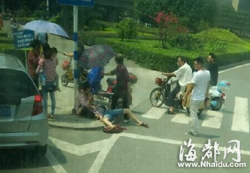 福州一男子骑车摔倒多处受伤 依姆帮撑伞遮阳