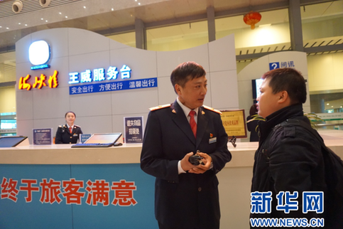 王威在为旅客介绍买票流程。新华网 李海韵摄 春运期间,火车站客流量陡增,在拥挤的人潮中,藏蓝色的身影会让旅客的内心平添一份安定。“您好,请问有什么可以帮您”,“您这趟车快到检票时间了,2号进站口人稍微少一点”,“退票请带身份证到5号窗口”。两小时下来,这样的话王威重复了成百上千次,手上水杯里的水却几乎未少。 等到同事来接岗,王威回到岗亭短暂地休息一会儿,“好多人第一次来福州南站,地形不熟、程序不熟是很正常的事情,服务台不仅要有耐心,而且要细心。”话音未落,他急忙拧开杯盖,咕咚咕咚一下喝掉大半杯水。 福州车站的“王威服务台”里,常年摆放着许多“宝贝”:药品箱里备着速效救心丸、云南白药、藿香正气水,百宝箱里放着剪刀、针线包、信纸,便民箱里是编织袋、绳子和雨伞,还有轮椅、担架、扁担等等,凡是旅客旅行所需的应急物品一应俱全。