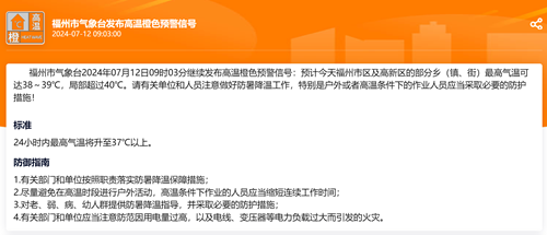 福州市气象台2024年07月12日09时03分继续发布高温橙色预警信号:预计今天福州市区及高新区的部分乡(镇、街)最高气温可达38~39℃,局部超过40℃。请有关单位和人员注意做好防暑降温工作,特别是户外或者高温条件下的作业人员应当采取必要的防护措施! 标准 24小时内最高气温将升至37℃以上。 防御指南 1.有关部门和单位按照职责落实防暑降温保障措施; 2.尽量避免在高温时段进行户外活动,高温条件下作业的人员应当缩短连续工作时间; 3.对老、弱、病、幼人群提供防暑降温指导,并采取必要的防护措施; 4.有关部门和单位应当注意防范因用电量过高,以及电线、变压器等电力负载过大而引发的火灾。