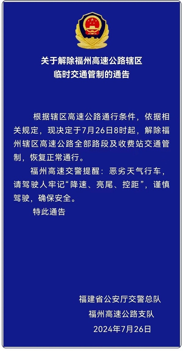 东南网7月26日讯 今日,福州高速交警发布《关于解除福州高速公路辖区临时交通管制的通告》,决定于7月26日8时起,解除福州辖区高速公路全部路段及收费站交通管制,恢复正常通行。 全文如图: