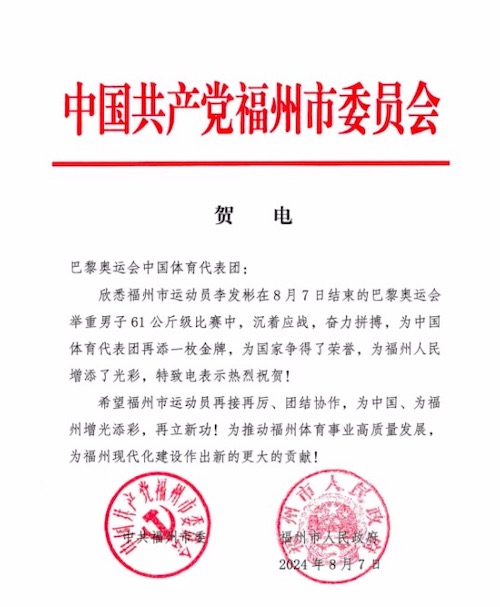 东南网8月7日讯(本网记者 朱琳)8月7日,在巴黎奥运会举重男子61公斤级比赛中,李发彬以抓举143公斤、挺举167公斤、总成绩310公斤的成绩夺冠,并打破奥运会抓举纪录。为中国举重队迎来“开门红”,也是福建在本届奥运会上夺得的首枚金牌。福州市委市政府发出贺电,全文如下: 贺电 巴黎奥运会中国体育代表团: 欣悉福州市运动员李发彬在8月7日结束的巴黎奥运会举重男子61公斤级比赛中,沉着应战,奋力拼搏,为中国体育代表团再添一枚金牌,为国家争得了荣誉,为福州人民增添了光彩,特致电表示热烈祝贺! 希望福州市运动员再接再厉、团结协作,为中国、为福州增光添彩,再立新功!为推动福州体育事业高质量发展,为福州现代化建设作出新的更大的贡献! 中共福州市委 福州市人民政府 2024年8月7日