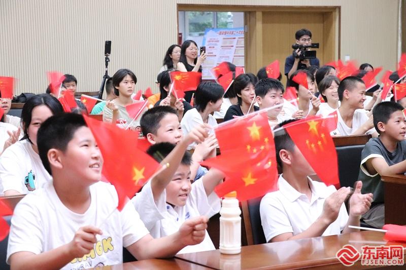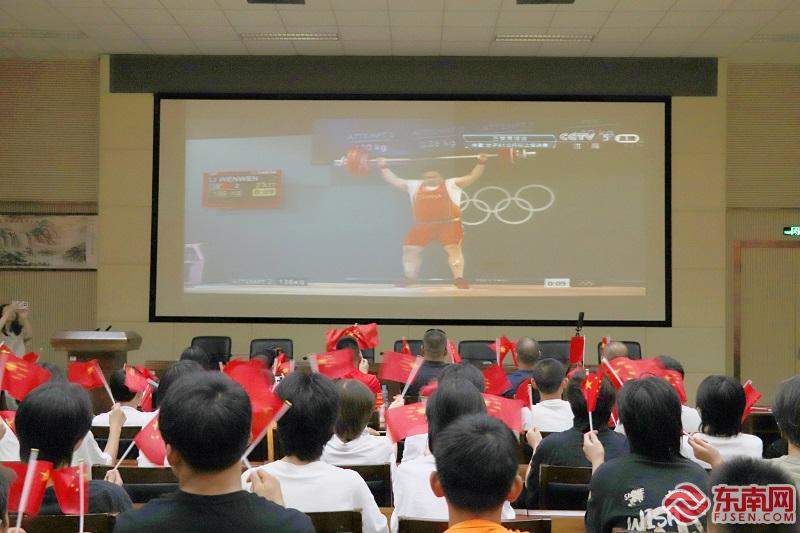 青少年运动员们为李雯雯试举成功欢呼。东南网记者陈巧玲 摄 在福州市体工队集中观赛间,举重教练及众多青少年运动员组成的观赛团共同见证这一激动人心的历史时刻。现场气氛紧张而热烈,每当李雯雯走上举重台,观众们手挥国旗,加油声如潮水般涌来。随着最后一声清脆的杠铃落地声,现场爆发雷鸣般的掌声与欢呼声。