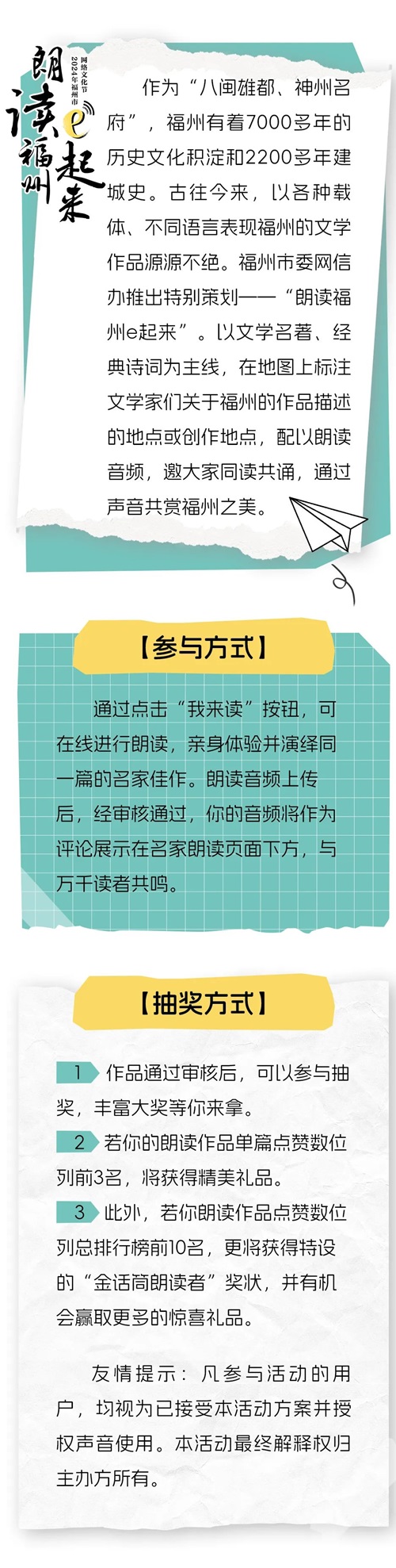 推动福州文化魅力在网上掀起一波音浪。“朗读福州 e起来”将广泛邀请万千网友共读共鸣,打造热门网络话题,这份文化地图等你来解密! 让我们一起跨入这场穿越时空的文学盛宴,广大网友可以参与互动环节,快来看看是怎么玩的吧! 玩法介绍来了 操作指南如下,快快收好✔