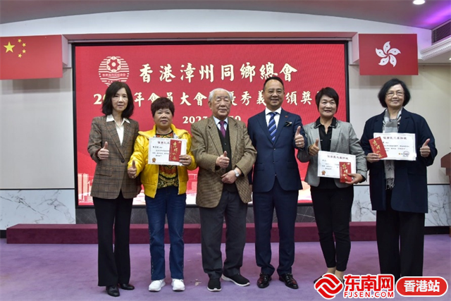 合影 东南网香港1月5日讯(特约记者 沉文川)近日,漳州同乡总会举行会员大会暨2023年优秀义工颁奖典礼。出席会议的有香港福建社团联会荣誉主席、漳州总会永远会长林广兆,香港福建社团联会副主席、漳州总会永远会长郑亚玲,福建省政协委员、香港福建社团联会副主席、漳州总会会长郭绿明,福建省政协委员、漳州总会理事长林津玲,漳州市政协常委、漳州总会监事长杨小龙,漳州总会永远名誉会长张俊达、杨炳川,各属会会长和活动骨干,青委会和妇委会活动骨干,2023年被评为卓越义工、杰出义工和优秀义工等近400人出席。大会由名誉会长沉文川主持。
