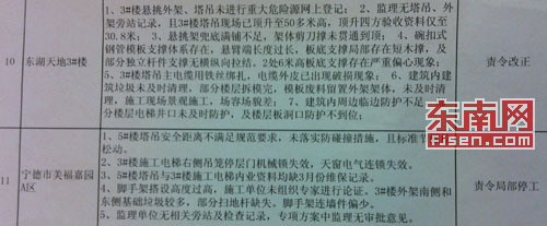 11个在建项目分别为:海天?水岸阳光三期2#楼、东城水岸6、9、12、15#楼、宁德市华侨小学扩建一期工程、福建东侨经济开发区保障性住房“幸福佳园”一期5#楼、君临天下三期北83#楼、天安?金域兰湾C区、宁德天水雅集3#楼、宁德市东湖御景三期22#楼、东湖天地3#楼,局部停工通知书一份是宁德市美福嘉园A区,累计对项目经理记分90分,对项目总监记分70分。