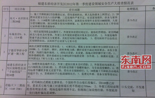 东侨建设部门通过此次检查发现,开发区建设系统在建项目的部分安全隐患问题反复出现,管理人员到岗情况不佳、安全内业资料不完善,安全防护措施落实不到位。检查组检查了东侨区内11个在建大型房地产项目,发现安全隐患45条,发出整改通知书9份,局部停工通知书一份。
