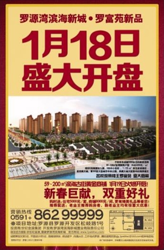 罗源湾滨海新城,1月18日罗富苑新品房源盛大开盘。59-200㎡滨海古街黄金商铺,1月19日火爆开启!新春巨献,双重好礼。购时送:住宅5000元/套,商铺8000元/间,更有精美礼品等着您!推荐就送:老业主推荐购房者,新老业主均有惊喜大优惠!
