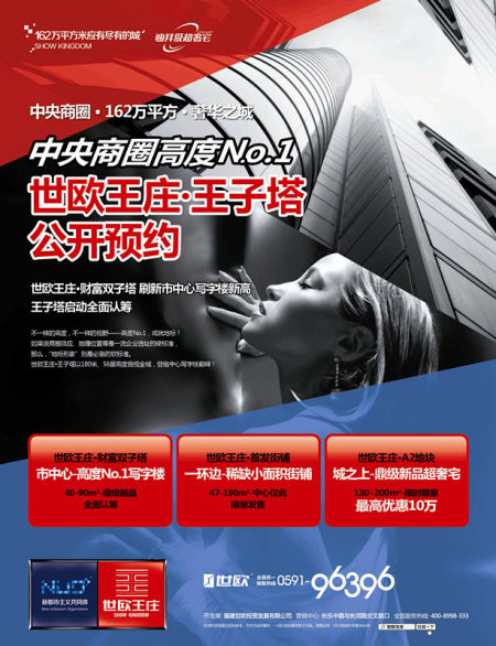 世欧王庄王子塔全新40-90平市中心迪拜级全景写字楼公开预约,不限购,不限贷。中央商圈,第一高度。A2地块130-200㎡限时限量最高优惠10万。楼王300㎡“一号作品”全面预约中。47-190㎡市中心小面积沿街商铺,席位限量发售。 作为亚太最大磅礴共同体,世欧王庄以42栋迪拜级超高层钻石建筑、30万方顶级时尚中心的磅礴之势,造就162万方的亚太最大共同体、海西首个迪拜级“超豪宅”,震撼福州。而今,王庄更以全新A1地块揭开2013年品质升级的序幕,携手意大利国宝级设计名师MauroLipparini展开一次关于顶级豪宅的跨国灵感创作,定制代言十六类品味人群、十六种奢华生活的“十六间宅”产品系,并以“定制级”理念实现项目的升级与超越,揭幕福州豪宅奢享新篇章!
