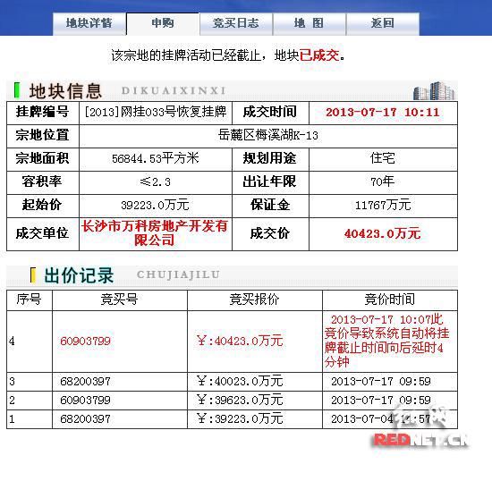 长沙土地网挂系统曝故障 卓越称梅溪湖拿地被坑