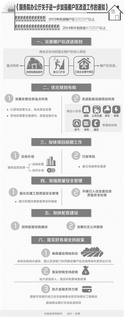 8月4日,国务院办公厅对外发布《关于进一步加强棚户区改造工作的通知》,要求各地区、各有关部门进一步加大棚户区改造工作力度,力争超额完成2014年目标任务,并提前谋划2015—2017年棚户区改造工作。 安置首次尝试共有产权 去年7月《国务院关于加快棚户区改造工作的意见》印发以来,新一轮棚改明显提速。2013年改造各类棚户区320万户以上,2014年计划改造470万户以上。然而,目前棚改的进度与改造约1亿人居住的城镇棚户区和城中村的要求相比,还有较大差距;棚改中仍存在规划布局不合理、配套建设跟不上、项目前期工作慢等问题。 此次发布的《关于进一步加强棚户区改造工作的通知》,首次将央企棚户区明确纳入棚改规划。各地区要在摸清底数的基础上,抓紧编制完善2015—2017年棚户区改造规划,将包括中央企业在内的国有企业棚户区纳入改造规划,重点安排资源枯竭型城市、独立工矿区和三线企业集中地区棚户区改造,优先改造连片规模较大、住房条件困难、安全隐患严重、群众要求迫切的棚户区。 在选点布局上,棚改安置房不再是独立的区域,也被纳入新型城镇化的整体布局。《通知》要求市、县人民政府应结合棚户区改造规划、城市规划、产业发展和群众生产生活需要,科学合理确定安置住房布局。要统筹中心城区改造和新城新区建设,推动居住与商业、办公、生态空间、交通站点的空间融合及综合开发利用,提高城镇建设用地效率。鼓励国有林区(林场)、垦区(农场)棚户区改造在场部集中安置,促进国有林区、垦区小城镇建设。 棚改配套设施首次被要求与棚改安置住房同步报批。过去,棚改安置住房与配套设施被要求同步规划、同步施工、同步交付使用。此次《通知》增加了“同步报批”的环节,为优化棚改布局、防止“安置房晒太阳”,增加了制度保障。同时,《通知》也首次明确了棚改安置住房小区的具体配建项目和建设标准,应遵循《城市居住区规划设计规范》要求,标准更具体清晰,操作性更强。 棚改住房安置还将首次尝试探索共有产权的方式。过去,棚户区改造实行实物安置和货币补偿相结合,由棚户区居民自愿选择。对经济困难、无力购买安置住房的棚户区居民,是以租赁型保障房等方式满足其基本居住需求,或在符合有关政策规定的条件下,纳入当地住房保障体系统筹解决。 此次《通知》则明确提出,各地区可以探索采取共有产权的办法,做好经济困难棚户区居民的住房安置工作。 建立行政审批快速通道 棚户区改造任务重、链条长,需要发改、国土、住建、财政、金融、农垦、林业等多个部门协同推进。为了提高工作效率,我国将建立棚改的行政审批快速通道。 根据《通知》,市、县发展改革、国土资源、住房城乡建设等部门要共同建立棚户区改造项目行政审批快速通道,简化审批程序,提高工作效率,改善服务方式,对符合相关规定的项目,限期完成项目立项、规划许可、土地使用、施工许可等审批手续。 为了防止“棚改新房”变“闹心房”,《通知》还要求开展已入住安置住房质量安全检查。市、县人民政府要加强对已入住棚户区改造安置住房质量安全状况的检查,重点是建成入住时间较长的安置住房,对有安全隐患的要督促整改、消除隐患,确保居住安全。 棚改不是简单的“上楼”,也是棚户区居民市民化的过程,必须有完善的社区公共服务为依托。 与以往不同,《通知》首次提出新建安置住房小区要及时纳入街道和社区管理。安置住房小区没有实施物业管理的,社区居民委员会应组织做好物业服务工作。要发展便民利民服务,加快发展社区志愿服务。鼓励邮政、金融、电信等公用事业服务单位在社区设点服务。 进一步发挥金融支持作用 据住房和城乡建设部副部长齐骥介绍,目前尚未改造的棚户区大多位于中西部地区、独立工矿区、资源枯竭型城市和三线企业较集中的城市。建筑密度很大,商业开发价值较低,实施改造很难实现资金就地平衡,属于难啃的“硬骨头”。 啃下“硬骨头”,关键要破解“地从哪儿拨”“钱从哪儿来”。 今年470万套棚改的投资规模上万亿元,仅靠财政支持,缺口较大。“未来将在落实财税支持政策的同时,将进一步发挥开发性金融在棚改中的作用。”齐骥介绍,国家开发银行已成立住宅金融事业部,重点支持棚户区改造及城市基础设施等相关工程建设。纳入国家计划的棚户区改造项目,国家开发银行的贷款与项目资本金可在年度内同比例到位。同时也鼓励商业银行等金融机构,积极支持符合信贷条件的棚户区改造项目。 《通知》还要求推进企业债券创新,支持承担棚户区改造项目的企业发行债券,优化棚户区改造债券品种方案设计,研究推出棚户区改造项目收益债券;与开发性金融政策相衔接,扩大“债贷组合”用于棚户区改造范围;适当放宽企业债券发行条件,支持国有大中型企业发债用于棚户区改造。支持金融机构创新金融产品和服务,研究建立完善多层次、多元化的棚户区改造融资体系。 如何确保建设用地供应?又如何防止出现“挂羊头卖狗肉”的用地乱象? 《通知》要求地方各级住房城乡建设、国土资源部门要共同商定棚改用地的年度供应计划,并将棚改和配套设施年度建设任务落实到地块。市、县规划部门应及时会同国土资源部门,严格依据经批准的控制性详细规划,确定