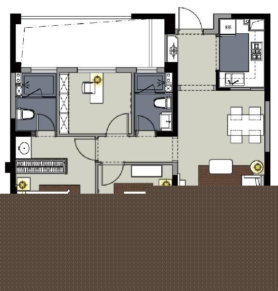 标准8--得房率高:88平=大卧室X3+全明卫生间X2;方正户型0浪费