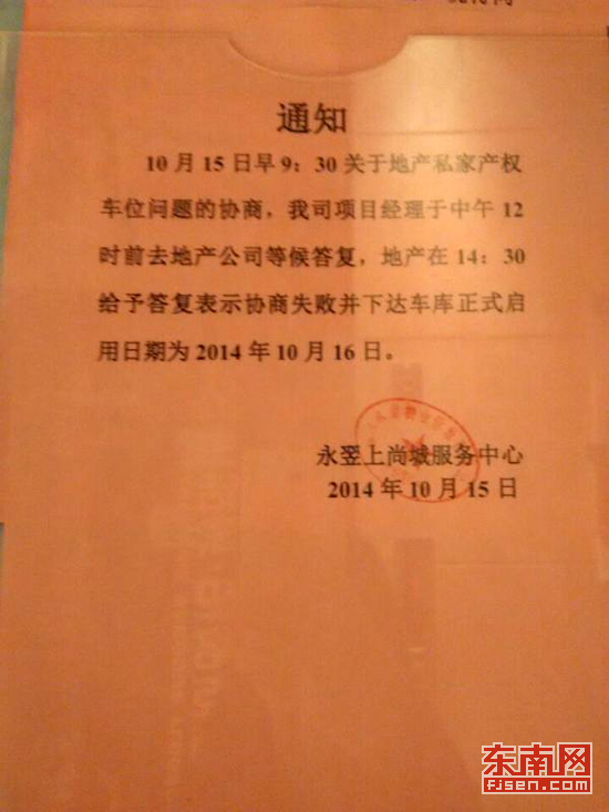 物业张贴的《通知》 东南网10月16日讯(本网记者 王坤明)10月8日,本网以《因不满停车费太高福州永翌上尚城业主停车堵住小区门》报道了位于福州市仓山区的永翌上尚城小区汽车停车位收费问题,当天开发商表示收费将推迟至本月15日,并于15日给业主最终答复。今日上午,记者了解到开发商拒绝了业主们的诉求,维持原来收费价格,并于今日开始收费。 小区业主潘先生告诉记者,10月8日当天开发商口头承诺本月15日会跟业主代表再协商后给出一个满意的答复,可是昨日下午小区物业处便贴出收费通知:车库正式启用日期为10月16日。今天上午,小区业主开车想进入小区被门口保安阻止,“要求我们要先到物业缴费才能够进入,许多业主不得已只能将车停在附近的空地或者路边。” 记者在小区内看到,每栋楼的一层楼道都张贴了一份物业中心发出《通知》,写着:“10月15日早9:30,关于地产私家产权车位问题的协商,我司项目经理于中午12时前去地产公司等候答复,地产公司在14:30给予答复表示协商失败并下达车库正式启用日期为2014年10月16日。” 此外,记者看到开发商福州永翌房地产开放有限公司给福州永翌物业管理有限公司的通知上写着“根据北京永翌职业有限责任公司研究决定个,就本公司开发项目永翌上尚城,关于未售出地下室私家产权车位租赁价格,按2014年8月23日发的通知文件规定执行”,即600元/月,另外收取物业管理费70元/月。 潘先生告诉记者,业主们昨天找到物业,但是物业工作人员仍表示“系按开发商的通知执行,业主维权应该找开发商”。 采访中,记者了解到,小区业主们坚持的诉求有两点:一是希望开发商能够参照附近“阳光城新界”小区车位收费,租赁价格在200—300元之间(含物业管理费),给予两年的缓冲期;二是部分由意愿购买车位的业主认为每个车位售价22万元太高,希望开发商能够降价出售,建议售价为15万元左右。 业主们仍表示:“希望开发商能够与业主代表再次坐下来协商,给出一个合理的价格。”