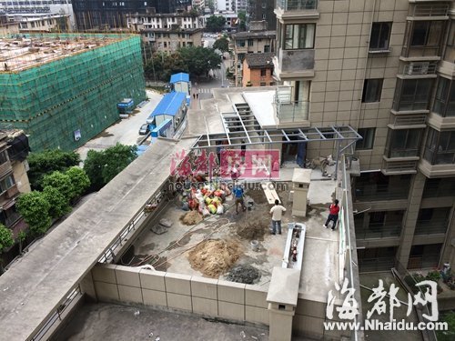 701室侵占的公共露台正下方就是抗议的业主家 楼上住户占用公共露台违建,楼下业主担心会威胁到自家安全,四处投诉无果,前日欲跳楼抗议,被物业苦劝一个多小时才劝下。但福州鼓楼区建华温泉公寓二期2号楼701室的业主不仅未停工,反而抓紧违建施工。 露台被搭铁架 业主加紧违建 昨日,该小区物业刘主任告诉记者,前日上午确实有位业主站在2号楼天台,要往下跳,“我安慰了一个多小时才把他劝下来”。 记者辗转联系上了这位业主,他表示,自家屋顶就是露台,一旦被楼上业主占用违建,他的屋子很可能开裂。该业主说,他曾四处投诉,但都没有效果,只能希望用这种方式引起有关部门重视。 记者随后进入701室,发现通向露台的墙体已被敲掉,并向外扩建了一间面积大约10平方米的房间。露台被搭了铁架,堆满施工材料,多位工人正在施工。 现场一位穿着红色马甲的女士,见到记者后立即冲上前抢夺记者的手机,并把记者推向门外。事后物业刘主任确认她为该户业主。“他们在抓紧施工,想造成既成事实。”刘主任说。 物业多次贴整改书 业主撕掉或拒接 刘主任说,701室在年初刚开始违建时,物业就贴了整改通知书。此后物业又数次下发通知书,但这户业主要么撕掉,要么干脆拒接。 鼓楼区水部街道城管中队的工作人员表示,已经对该户业主下达整改通知书;如果对方不自行拆除,会将情况上报给鼓楼区市容局,由区级市容部门组织强拆。