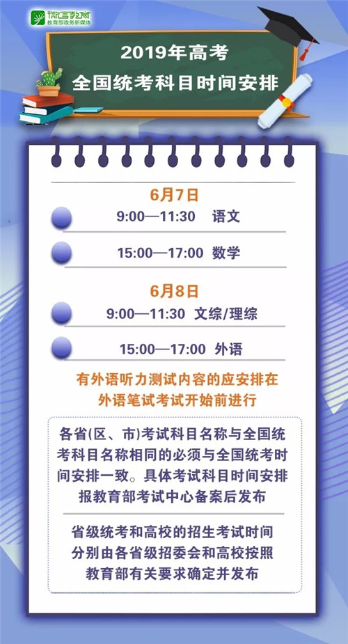 近日,教育部印发《关于做好2019年普通高校招生工作的通知》,对今年普通高校招生工作进行全面部署,提出要确保高校考试招生工作公平公正、规范有序。 《通知》的附件《2019年普通高等学校招生工作规定》明确了今年考试时间:6月7日9:00至11:30语文;15:00至17:00数学。6月8日9:00至11:30文科综合/理科综合;15:00至17:00外语,有外语听力测试内容的应安排在外语笔试考试开始前进行。各省(区、市)考试科目名称与全国统考科目名称相同的必须与全国统考时间安排一致。具体考试科目时间安排报教育部考试中心备案后发布。省级统考和高校的招生考试时间,分别由各省级招委会和高校按照教育部有关要求确定并发布。 《通知》的具体内容随小编一起看↓↓↓