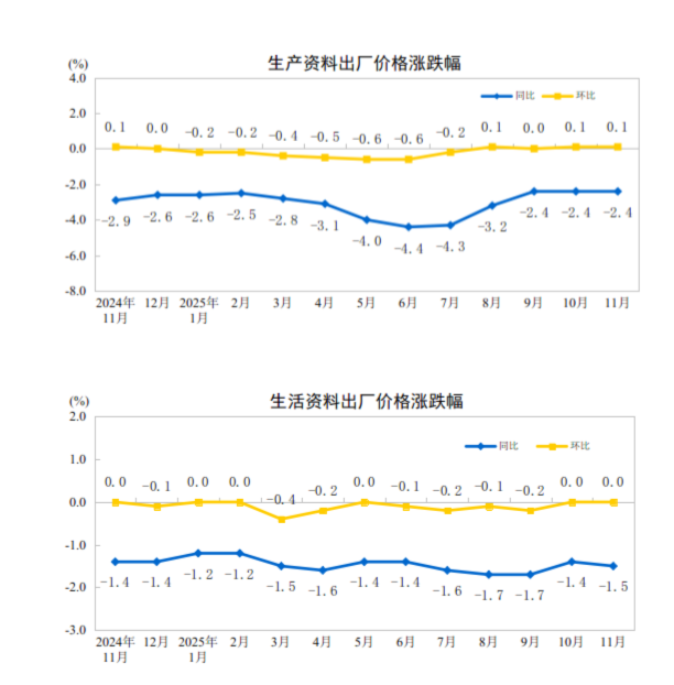 2025年11月份,全国工业生产者出厂价格同比下降2.2%,工业生产者购进价格同比下降2.5%;工业生产者出厂价格和购进价格环比均上涨0.1%,涨幅均与上月相同。1—11月平均,工业生产者出厂价格比上年同期下降2.7%,工业生产者购进价格下降3.1%。