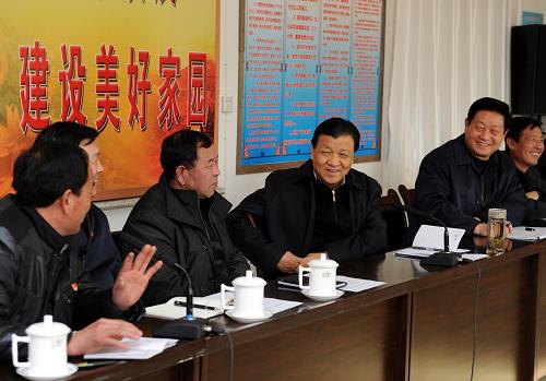 1月11日至14日,中共中央政治局常委、中央书记处书记刘云山在陕西延安、榆林两地就贯彻落实党的十八大精神、开展群众路线教育实践活动进行调研。这是1月14日,刘云山在榆林市榆阳区金阳小区调研社区党建工作。新华社记者饶爱民 摄