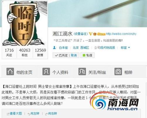 网友反映海口运管处工作人员的“不雅”行为(新浪微博截图) 网友:调侃运管处工作人员的行为,有部分质疑 该微博发出后,引起广大网友关注,大部分网友对海口运管处工作人员在上班时间做出的这些举动表示惊讶和气愤。 网友“青岩”:“海南自去年6月开始了为期一年的整治干部“庸懒散奢贪”问题,屈指一算,到今年7月刚好过了整治期。整治期一过,是否就意味着“庸懒散奢贪”问题死灰复燃呢了?官方的出发点是好的,但如果只是吹吹风,走走过场,只怕也是治标不治本。” 网友“海南浪子文”调侃:“按摩的手法很专业嘛~~不去开按摩店,太可惜了~~~” 网友“海南图卦”也调侃:“正面报导,《十二小时工作累跨女运管,男同事帮忙按摩缓解酸痛。》” 也有部分网友质疑,发出该微博的网友是否是在中午下班时候所拍。 网友“Zooey-Beat-Gaddafi”说:“至少要把你拍照的注明,否则10分钟前拍的也就12点多,机关的午休时间不是很正常吗?” 对此,“湘江滴水”在微博上还说,除了微博上的照片还拍有视频,这对按摩的工作人员从9点多一直按摩到10点,玩手机那两位,估计从上班玩到下班。 “湘江滴水”也向南海网提供了男性工作人员为女性工作人员按摩,和另一名女性工作人员玩手机的视频。 |