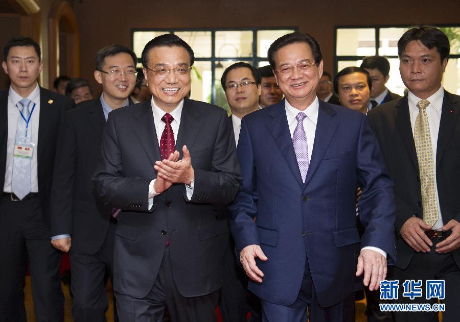 10月15日,中国国务院总理李克强与越南总理阮晋勇在河内共同出席中越工商界午餐会,并发表讲话。这是李克强同越南总理阮晋勇步入会场。新华社记者黄敬文 摄