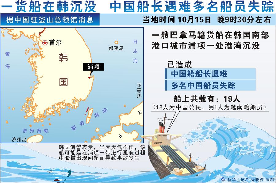 新华社照片,首尔,2013年10月15日 (国际)一艘巴拿马籍货船在韩国浦项港湾沉没 中国籍船长遇难 10月15日,在韩国浦项港湾,一艘巴拿马籍货船遭遇风浪,随后沉没。新华社图表,北京,2013年10月15日 图表:一货船在韩沉没 中国船长遇难多名船员失踪 新华社记者 胥晓璇 编制 |