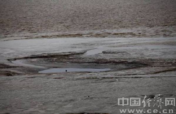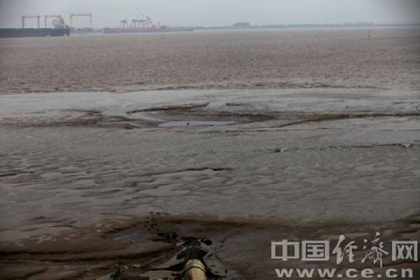 埋入淤泥下的管道排出污水将岸边的泥土冲击出一个大坑,只有在江水退潮时才能得见端倪。(蒋毅坤摄)
