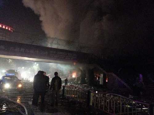 四川在线消息(记者钟帆)26日晚23时左右,泸州摩尔商城发生连环爆炸,旁边车站已经倒塌。据知情人士介绍,爆炸的起因应该是商城内一个餐厅液化气罐首先爆炸,从而蔓延开来,导致连环爆炸。记者从泸州消防部门了解到,已出动100余名消防官兵救援,目前伤亡情况暂不明。 据了解,目前火势仍然很大,一、二楼明火,以上楼层全被浓烟包裹。一楼商铺多数已经烧毁,浓烟窜到了几百米高,4楼还有人员被困。