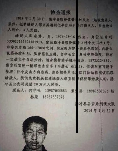 犯罪嫌疑人邵宗其 原标题:云南腾冲猴桥凶杀案致6人死亡 公安机关披露嫌犯杀人动机 人民网昆明1月31日电 (徐前)据云南省腾冲县政府新闻办31日最新通报,2014年1月30日,腾冲县猴桥镇箐口村发生一起故意杀人案,致6人死亡,3人受伤。 经公安机关初步侦查:犯罪嫌疑人邵宗其发现妻子与被害人邵宗平、邵宗华等本村村民有不正当男女关系后,心理失衡,对邵宗平、邵宗华两户实施了故意杀人报复行为。 犯罪嫌疑人邵宗其,男,现年37岁,腾冲县猴桥镇箐口村小灰山村民小组人,案发后逃离现场。 目前,省市县三级公安机关正在全力开展对犯罪嫌疑人邵宗其的追捕工作。 |