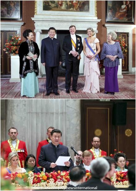 据新华社“新国际微博”报道,古老的阿姆斯特丹王宫,郁金香绽放,喜迎中国贵宾。习近平主席和夫人彭丽媛身着中式服装,出席威廉-亚历山大国王举行的盛大国宴。“白领结”盛装宴会,欧洲王室最高规格礼遇。中式服装,中华文化风采。两国元首深入交谈、亲切交流,历时四个小时。 |